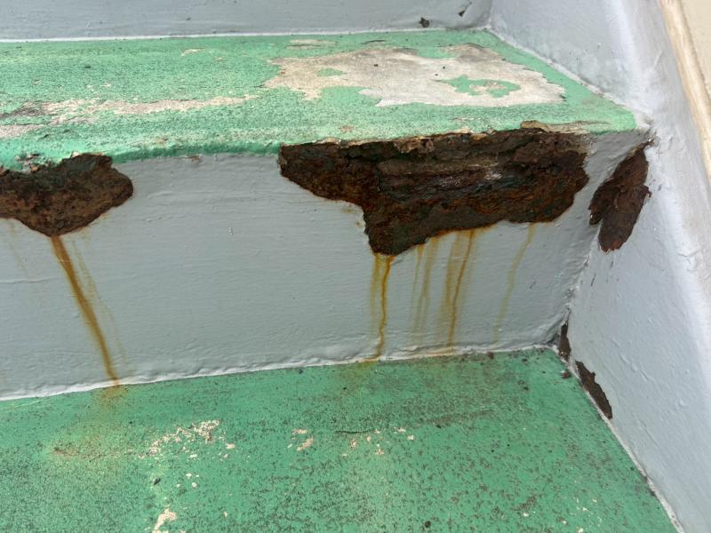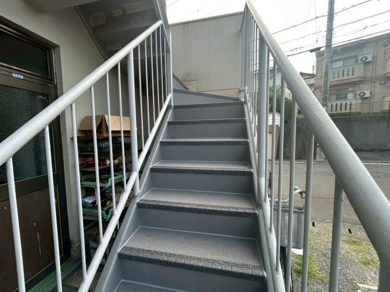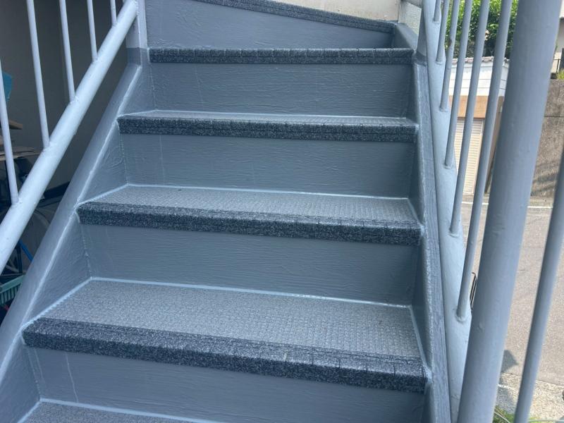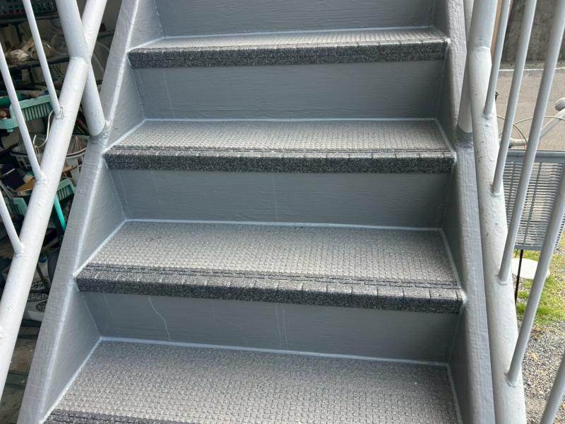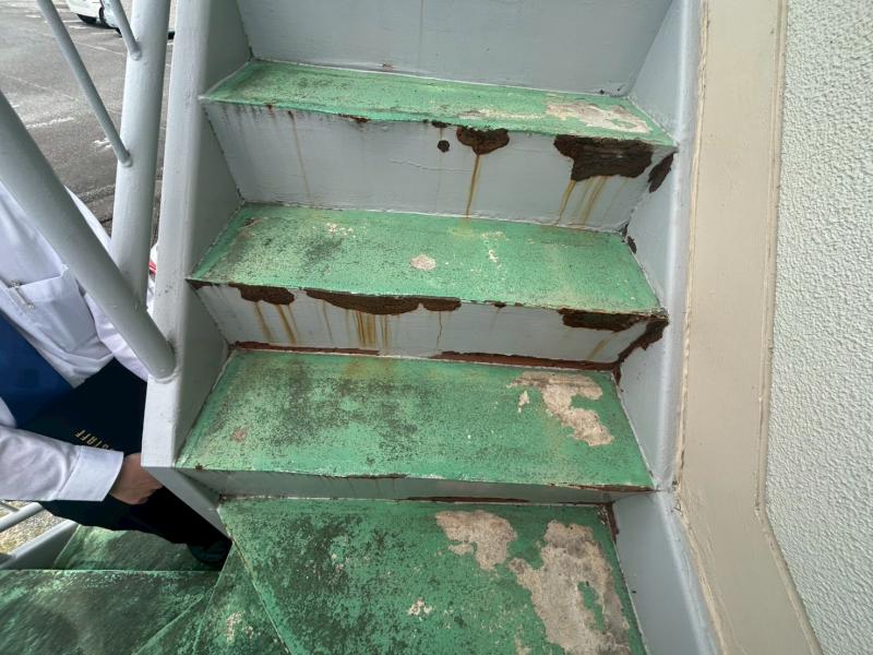 特に階段の蹴込み部分には広範囲にわたって錆が発生し、鉄部の腐食が著しく進んでいる状態でした。