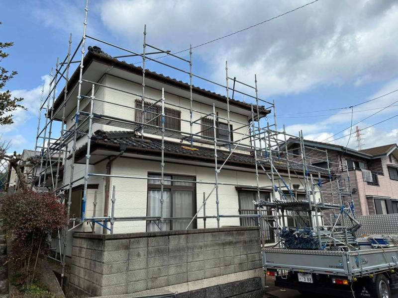 周南市で外壁塗装工事、外壁塗装の第一歩!足場設置と高圧洗浄
